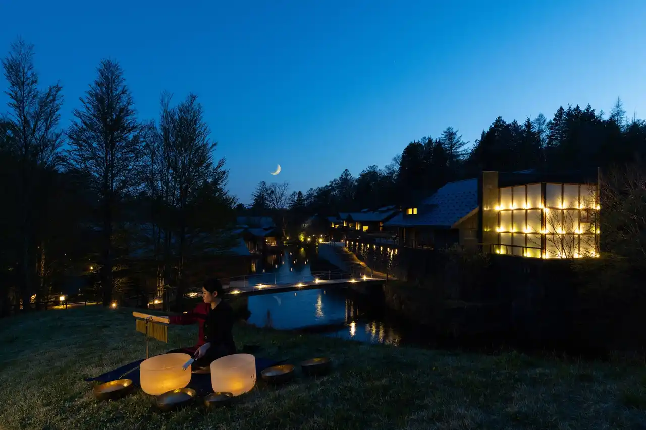 | 星のや軽井沢は山に囲まれた場所にあるため、普段は空の低い位置に昇る三日月を見る機会はあまりありません。しかし、この演奏会の日には、三日月がよく見える小高い丘で、月の光の下で自然を感じながら楽しめる演奏会を開催します。自然と一体となる静謐な空間で、三日月の優しい光と音楽に包まれ、心安らぐ瞬間(とき)を過ごせます。 | |||
