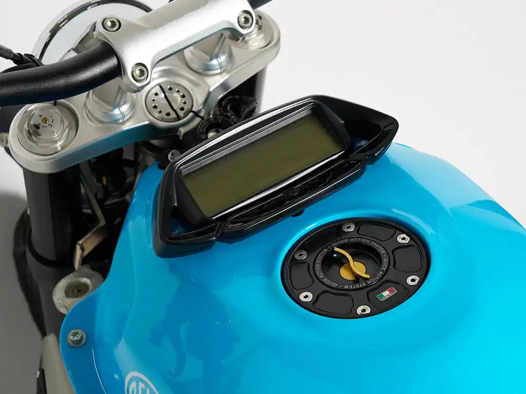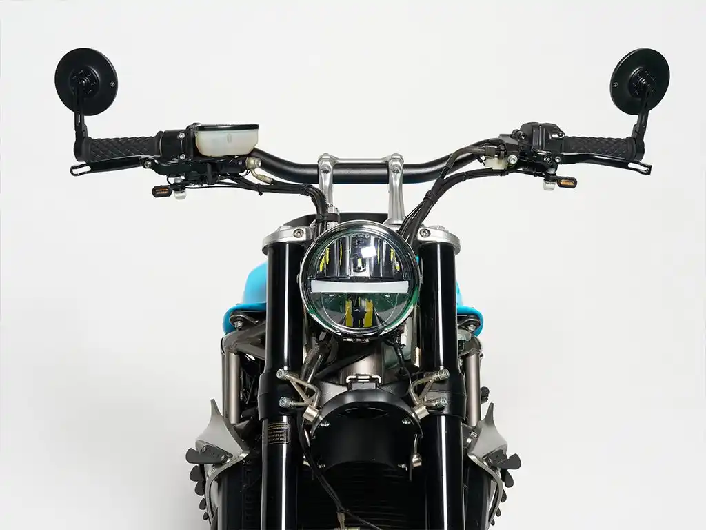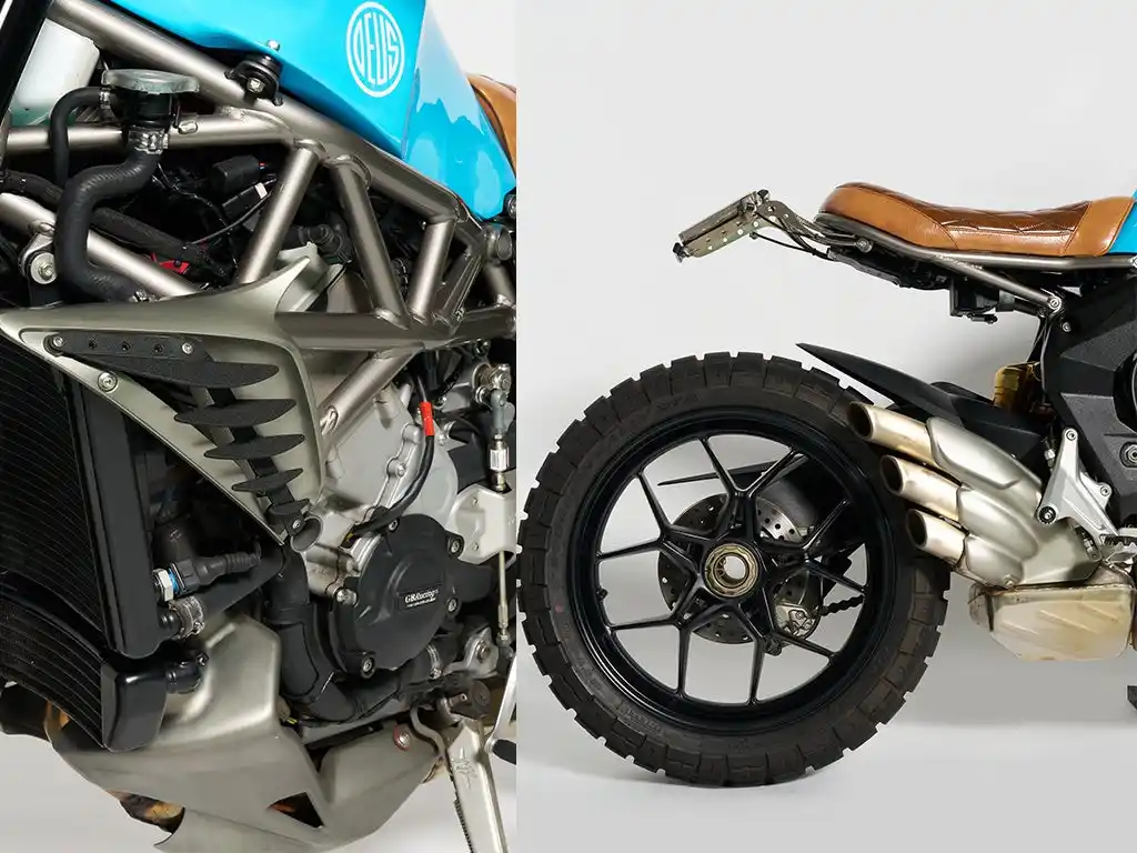 MV Agusta Rivale 800をベースに、Deus JapanのビルダーTomoyuki Soedaが手がけたBlucita。 特徴的なターコイズブルーの燃料タンクとキャメルブラウンのレザーシートが印象的で、軽快かつ洗練されたフォルムに仕上がっています。 コンパクトな車体に低重心化を施し、独特の3気筒エンジンのフィーリングを最大限に引き出す設計がなされています。 |