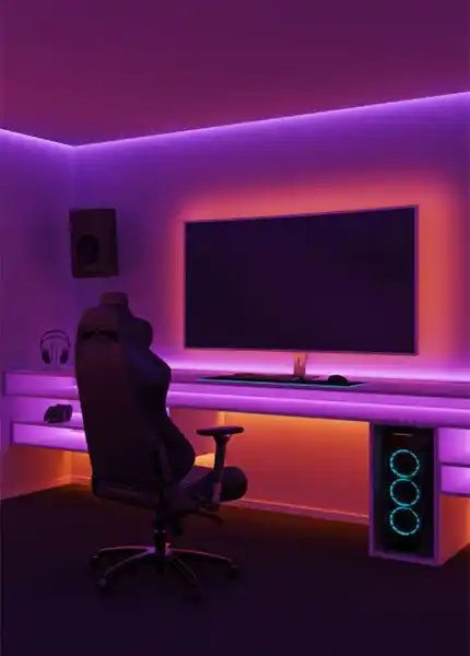 デスク周りや天井にグラデーションライトリボンを設置。 |