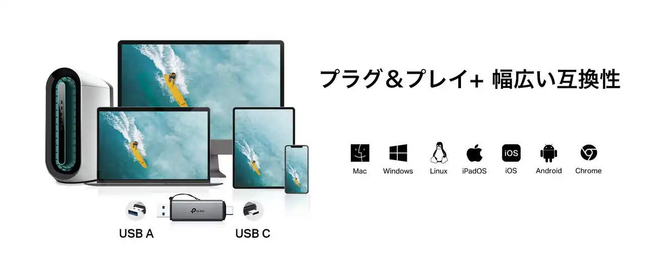 「UA430D」は、Windows・macOS・Linux OS・iPadOS・iOS・Android・ChromeOSなど、主要なOSに幅広く対応。ドライバーや面倒な設定は一切不要で、USB Type-C & Aボートに接続するだけですぐに使えます。自宅・オフィス・外出先など、どんなシーンでも即座に作業をスタートできる柔軟性とスピードを備えたガジェットアイテムです。 |