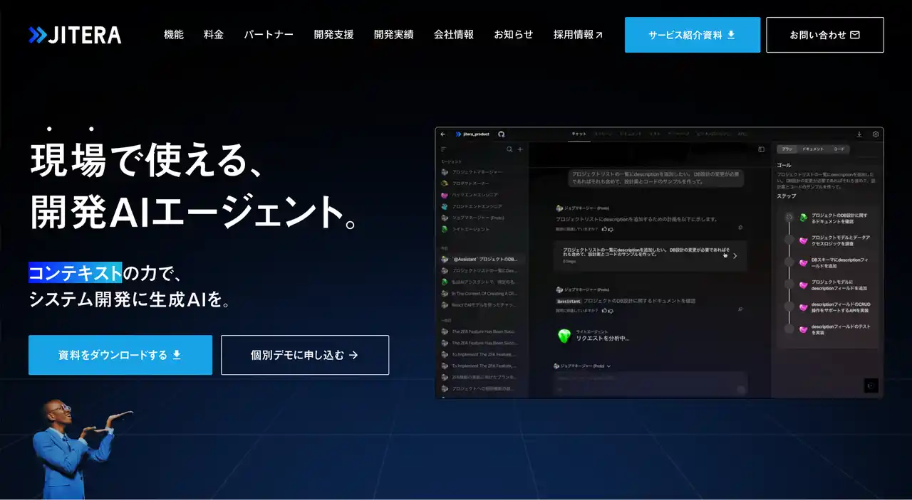 開発AIエージェント「Jitera」は、システム開発・システム改修を自動化するプラットフォームです。既存のシステムのソースコードを読み込み、システム構造を分析。高精度な設計書を自動生成し、システム開発・改修を効率化、コスト削減に繋げます。 |