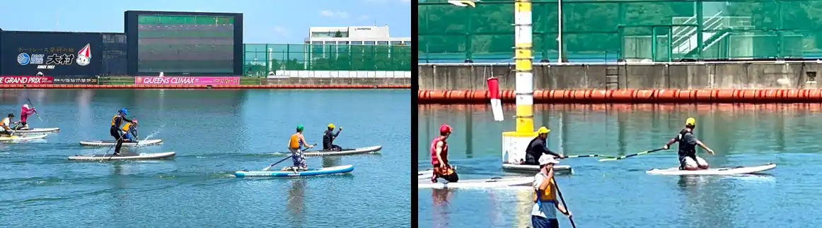 例年開催している大村湾フェスタ。今年は大村湾フェスタ史上初、競走水面でSUPレース大会を開催しました!2人1組で12チームを編成し、リレー形式で優勝を目指して競い合いました。 |