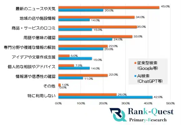 「最新のニュースや天気」(従来型検索45%・AI検索20%)や「地域の店や施設情報」(従来型検索34%・AI検索14%)、「商品・サービスの口コミ」(従来型検索35%・AI検索15%)といった項目では、従来型検索が圧倒的に多く利用されており、特にリアルタイムな情報や実生活に直結する情報において、従来型検索が高く評価されていることが分かります。