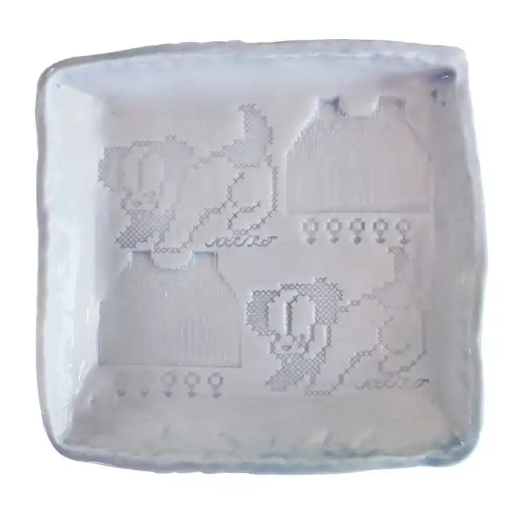 暖かい雰囲気の刺繍モチーフで製作した子犬と家のスタンプが押されている四角いプレート |