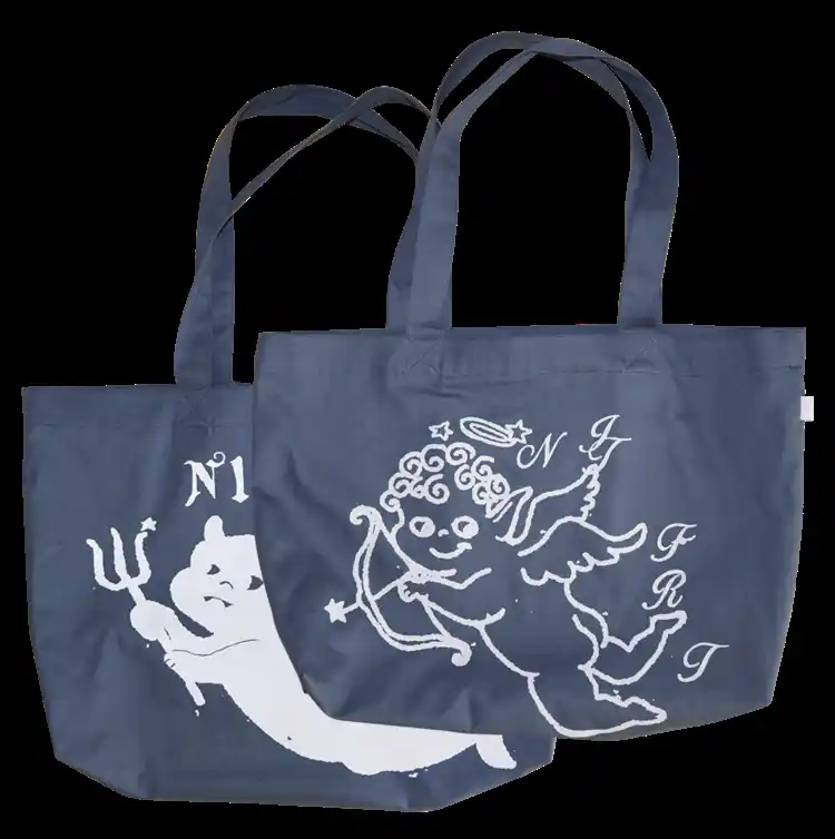 ナイトフルーティのちび天使と悪魔が両面にプリントされたトートバッグ |