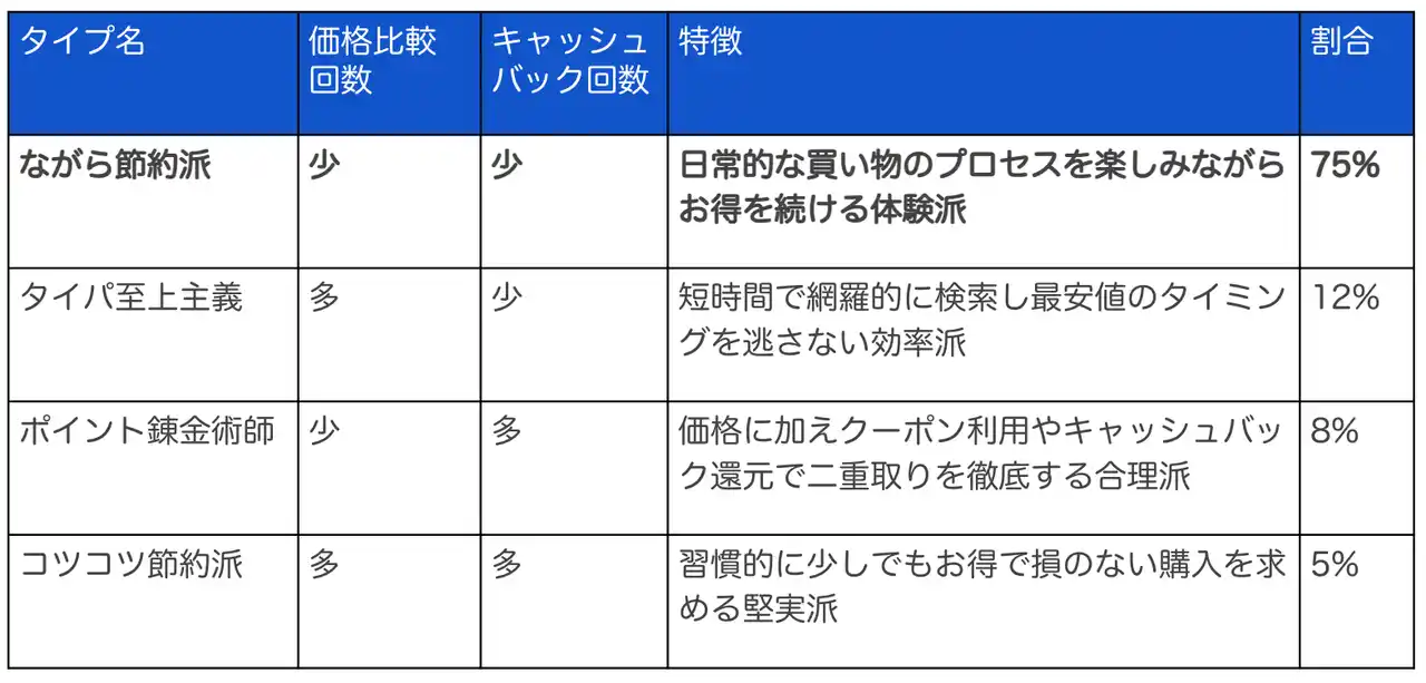 特に注目すべきは、日常的な買い物のプロセスを楽しみながら無理なく節約を楽しむ「ながら節約派」が全体の7割を占めている点です。これは、ポイ活等の能動的な行動よりも、自然体で無理なく節約を取り入れている利用者が多数であることを示しています。 |