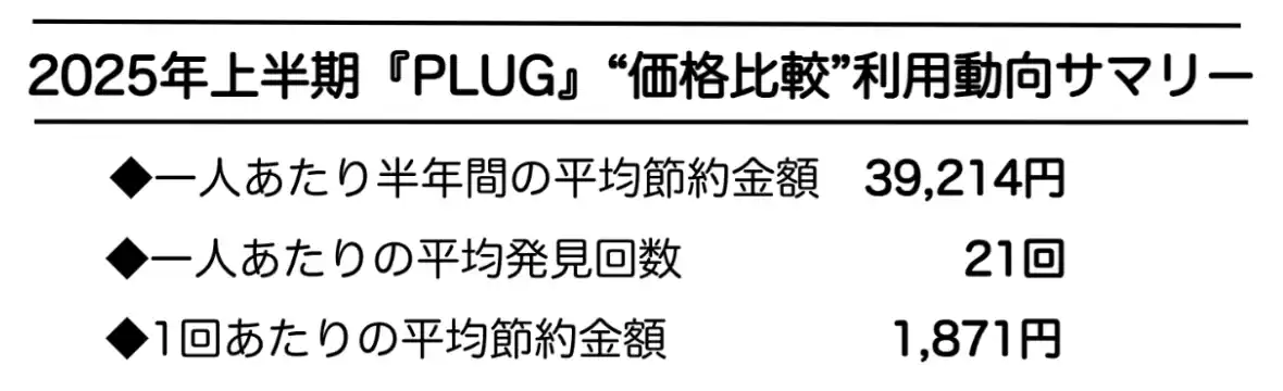ショッピングアシストアプリ『PLUG(プラグ)』を提供する株式会社STRACT(本社:東京都千代田区、代表取締役社長:伊藤 輝)は、2025年上半期(1月~6月)におけるユーザーのアプリ利用データを分析し、消費者の節約傾向や買い物スタイルに関する調査結果を発表しました。調査結果によると、半年間の一人当たり平均節約額(*1)は39,214円、ひと月当たりに換算すると6,535円の節約に成功していることがわかりました。