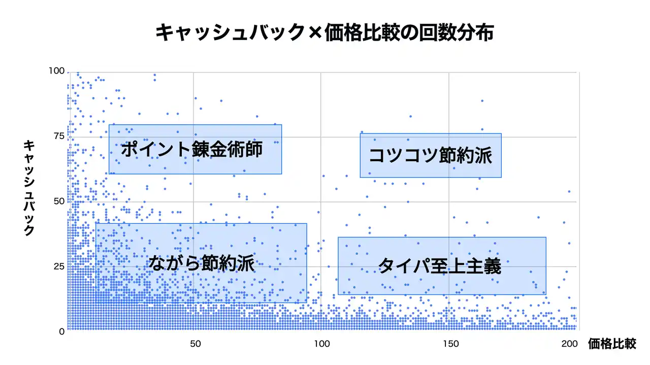 さらに、『PLUG』には「価格比較」と「キャッシュバック」の2つの機能がありますが、各機能の利用回数をもとに、ユーザーの節約行動は4タイプに分類されることがわかりました。 |