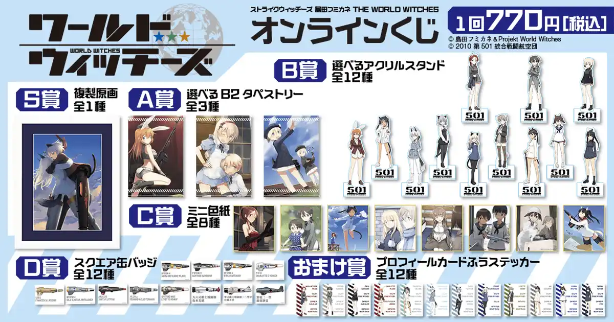 第501統合戦闘航空団、くじ引き堂にて作戦開始! 「ストライクウィッチーズ」に登場する個性豊かな12人のウィッチが、くじ引き堂に登場します。キャラクター原案の島田フミカネ氏のイラスト連載『ワールドウィッチーズ』にてかつて描かれた501メンバーの特別な姿や思い出のシーンがグッズとなりました。かわいくカッコいいアイテムの数々を、ぜひ入手してください! |