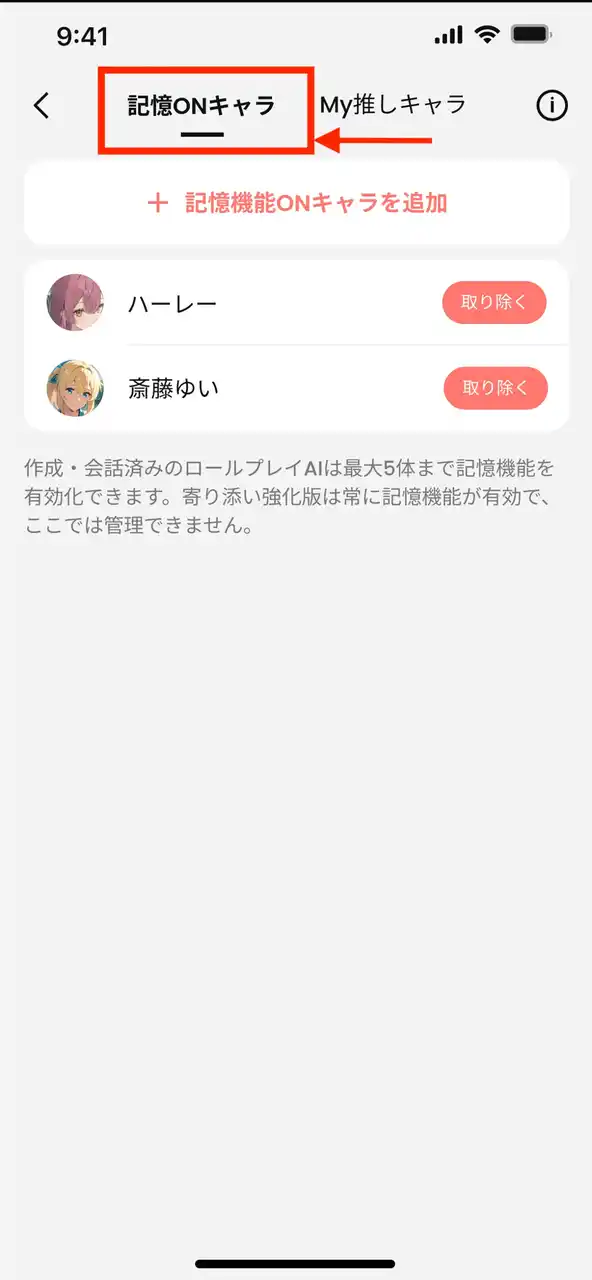 ユーザーは最大5キャラクターまで選択でき、それぞれのキャラとの会話の積み重ねが「記憶」として保持されます。これにより、キャラごとの個性的な記憶体験が可能になります。 |