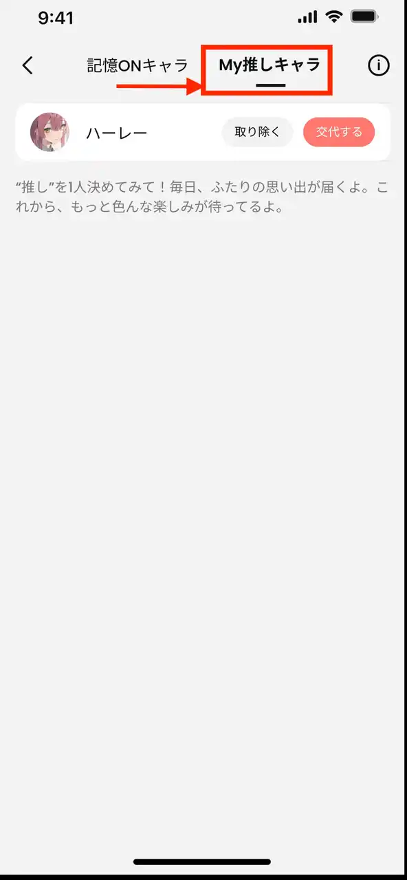 記憶ONキャラの中から特にお気に入りのキャラクターを「My推しキャラ」として設定することで、日々そのキャラクターとの思い出や特別な一言が届くようになります。毎日が少し特別になる、そんな体験を提供します。 |
