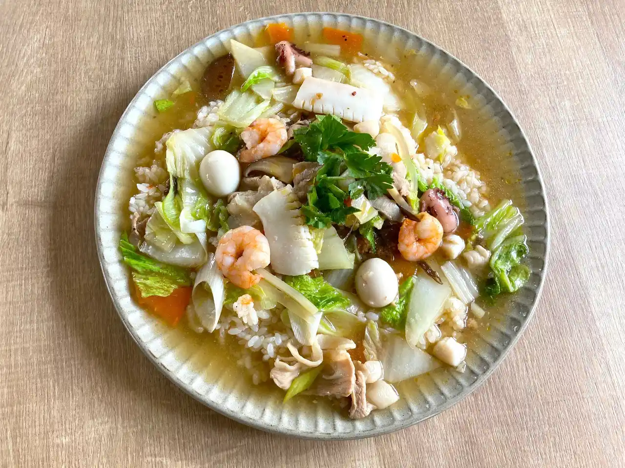 山椒は岐阜の高原山椒を使います。和風海鮮餡とおこげの下に高原山椒のキーマが隠れている盛り付けで、食べ進むうちにカレー風味に味変する仕様となっております。 |