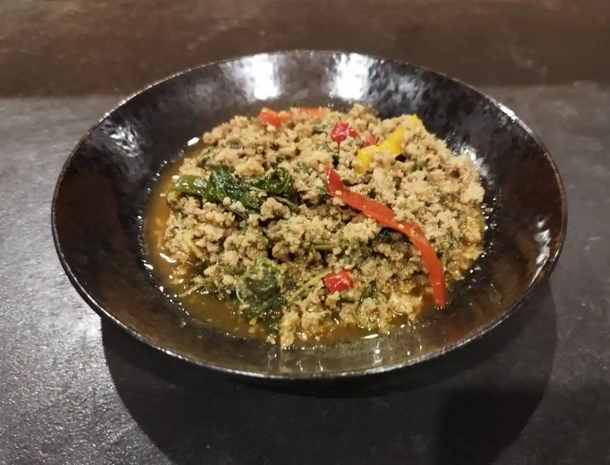 ガパオ炒めをベースに、独自ブレンドのスパイスとほんのり出汁を加えてアレンジしたポークキーマカレー。独特な香りが食欲を刺激するひと品です。 |