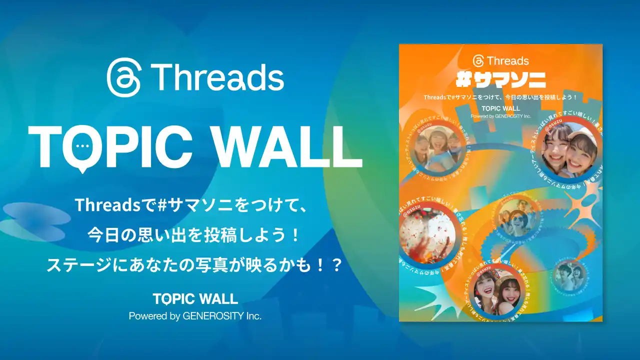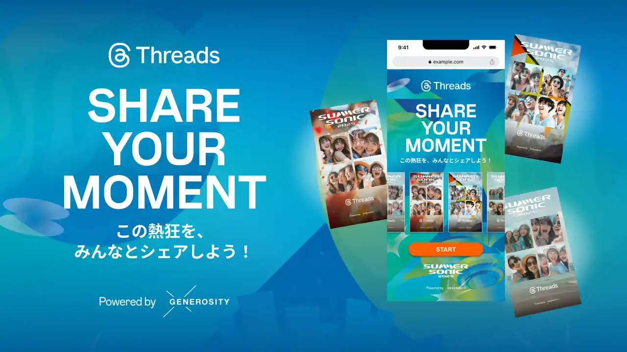 株式会社GENEROSITY(本社:東京都港区、代表取締役CEO:西垣 雄太、以下GENEROSITY)は、2025年8月16日(土)・17日(日)にZOZOマリンスタジアムおよび幕張メッセで開催される『SUMMER SONIC 2025(東京公演)』向けに、「Threads」と連動した新感覚の参加型体験サービスを開発いたします。 |