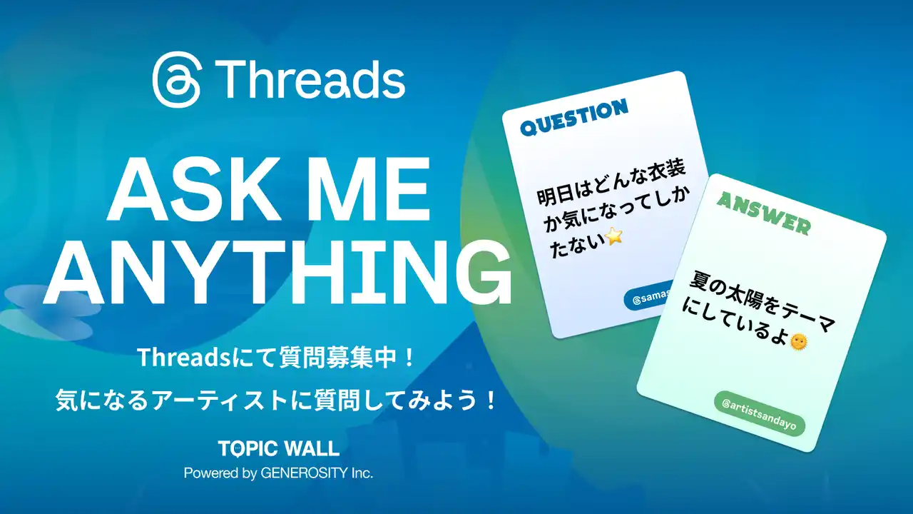 「SUMMER SONIC 2025」のThreads公式アカウント上で、出演アーティストへの質問ができるサービスです。来場者が投稿した質問はアーティストに届けられ、Threads上でアーティストから質問への回答を行います。オンラインとオフラインの垣根を越え、アーティストとの新たな交流体験が楽しめます。 |