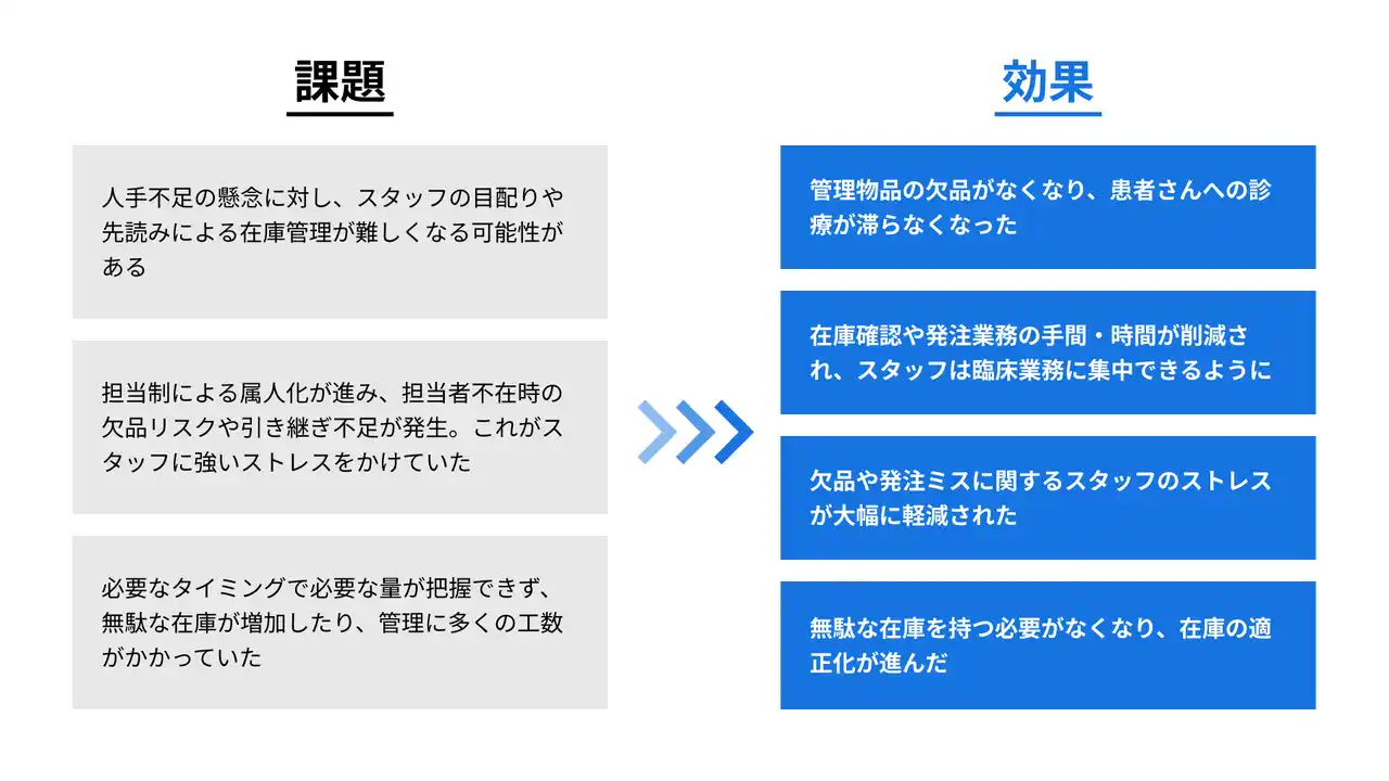 本事例では、1年365日休まず診療を行う現場において、属人化・工数増大・欠品リスクといった在庫管理の課題を、スマートマットクラウドの導入によって解決した取り組みをご紹介しています。