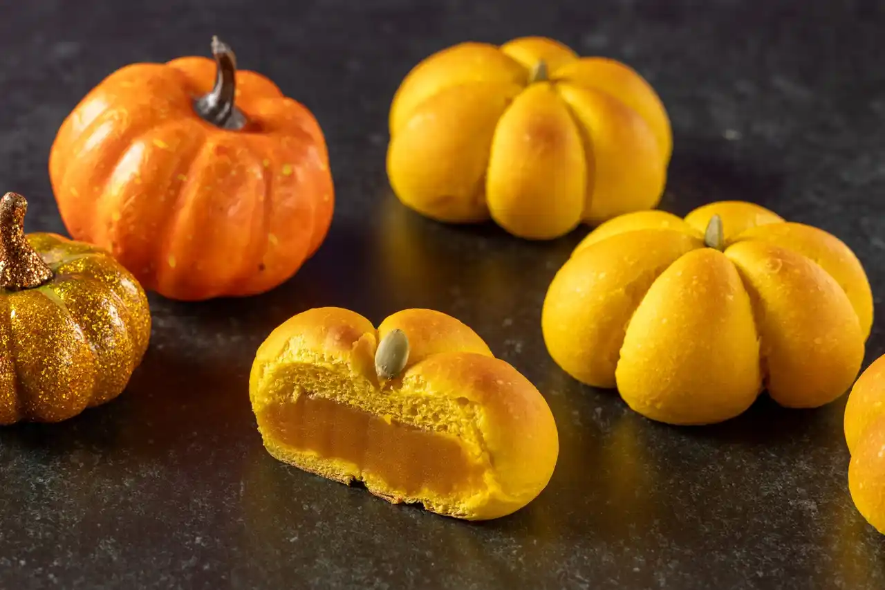 かぼちゃペーストを練り込んだ甘い香りのしっとり柔らかな生地に、素材本来の甘みを活かしたかぼちゃの餡をたっぷりと詰め込み、ころんとしたかぼちゃ型に焼き上げます。 |
