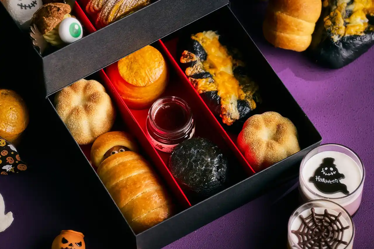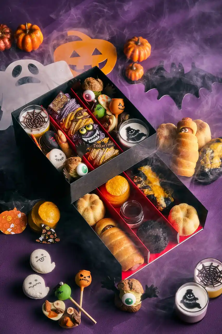 毎年ご好評をいただいているハロウィンスイーツとホテルメイドブレッドを詰め込む、テイクアウトボックスが今年も登場いたします。上段には、モンブランクリームに目玉と手を添えたモンスターのようなシュークリームや、愛らしい表情のおばけマカロン、少し不気味な指のクッキーなど“コワかわいい”スイーツが並びます。さらに、秋の味覚を楽しむかぼちゃと紫芋の2種類のロールケーキや、口当たりなめらかなパンプキンプリンなどもそろいます。下段には、ミイラをイメージしたブリオッシュなどのブレッドのほか、アフタヌーンティーに欠かせないスコーンを竹炭とスパイシーパンプキンの2種類ご用意いたします。 |