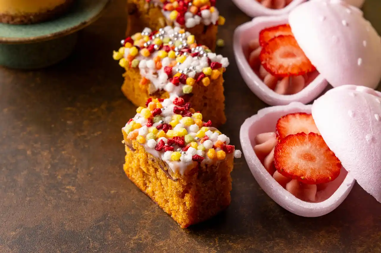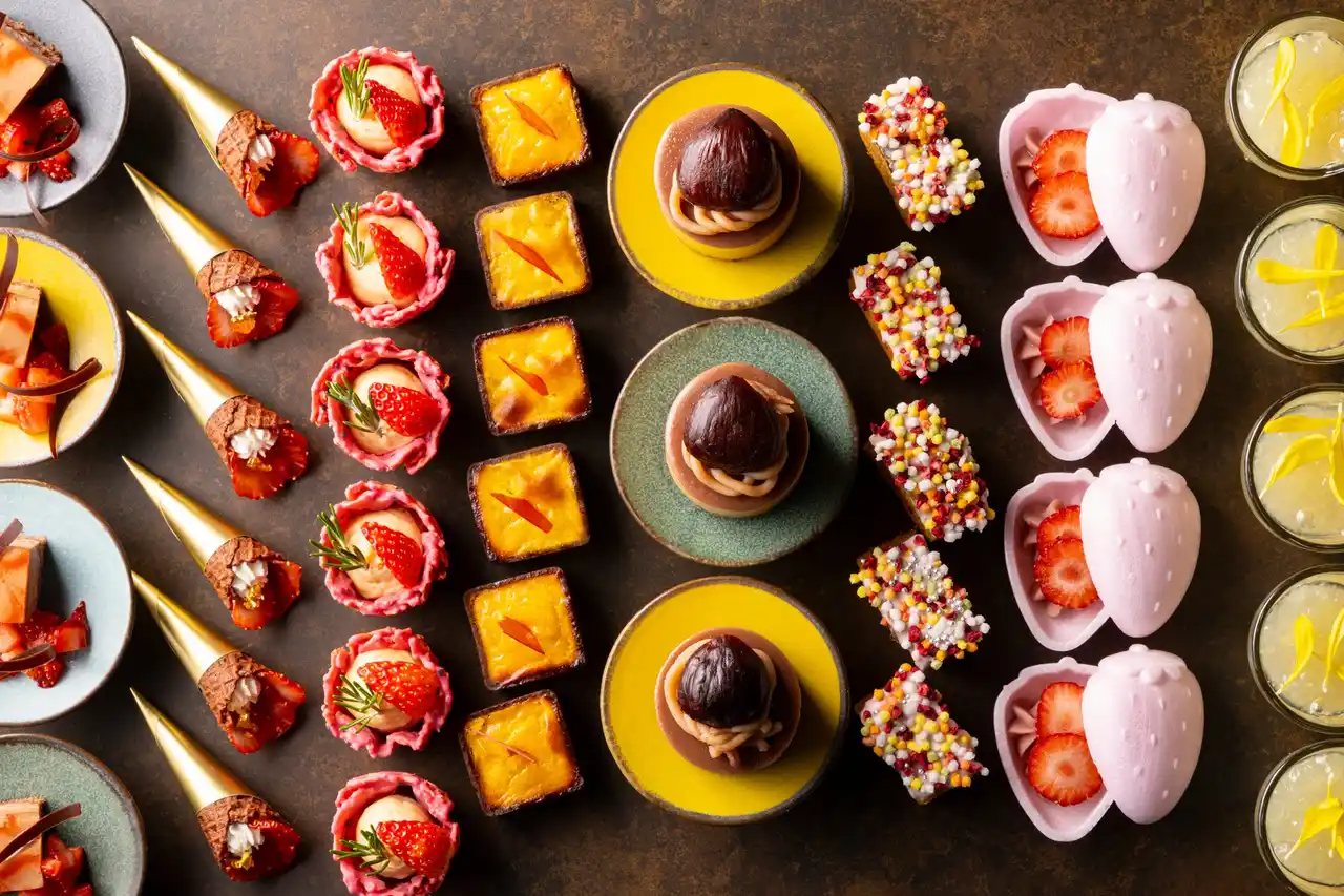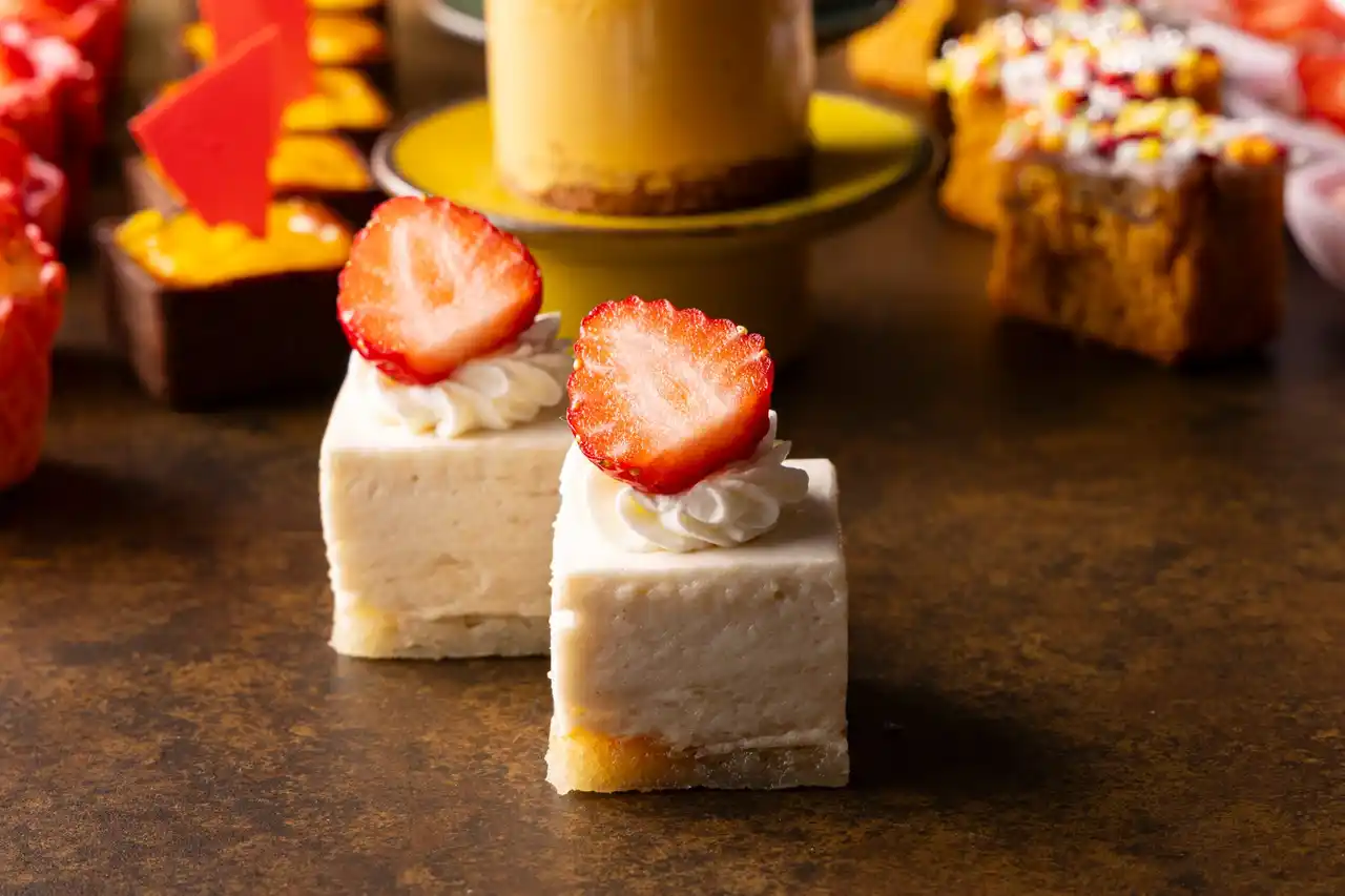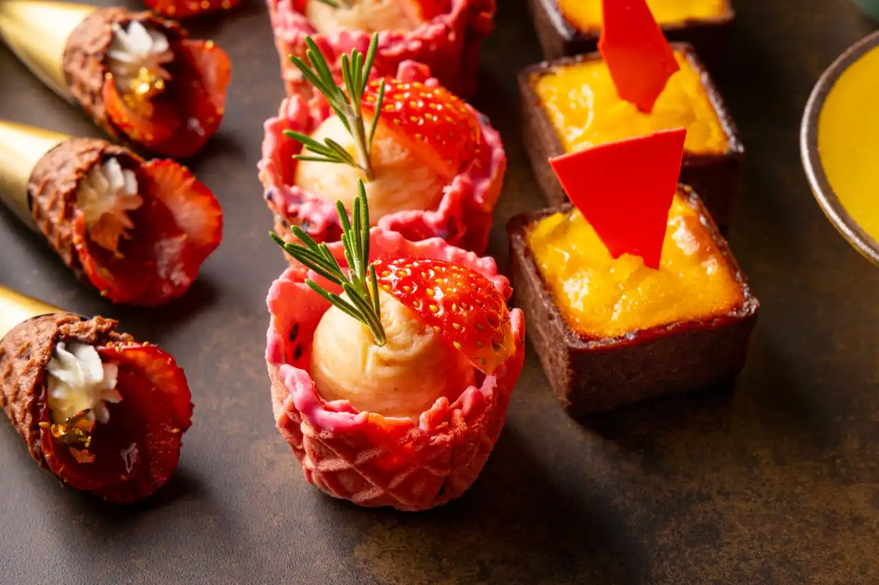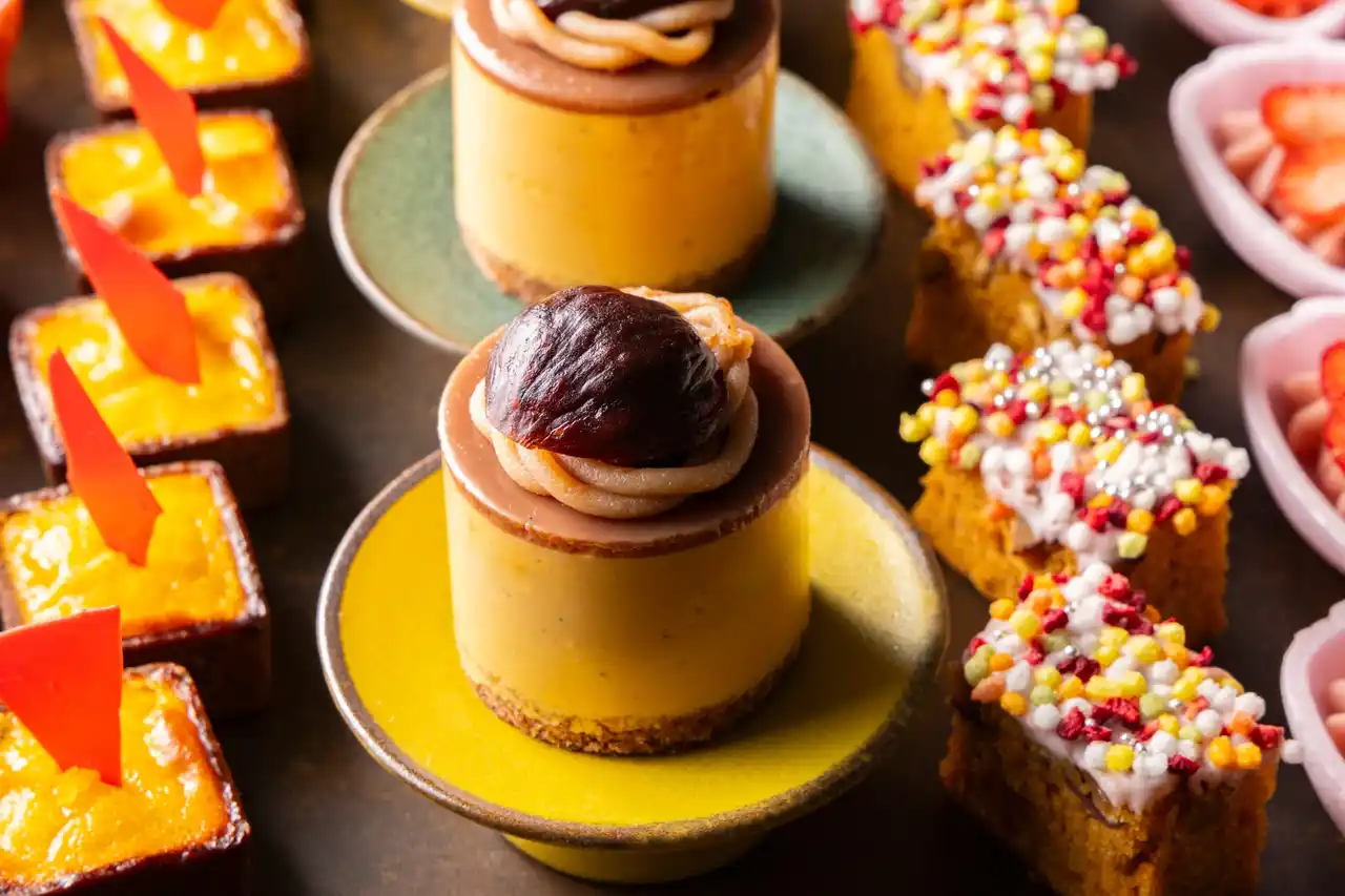サイズのフィンガースイーツが華やかにラインアップ。紅葉を思わせる色彩と、ほんのりこうばしい香りが漂います。今回のスイーツはフィンガースタイルで、手に取りやすく、次の“ひ・と・く・ち” へと誘われる、軽やかで心地よいスイーツビュッフェ体験に。また、塩味と甘味の絶妙なバランスにもこだわり、甘さだけに頼らない、今の気分に寄り添う大人のスイーツ時間をお楽しみいただけます。 |