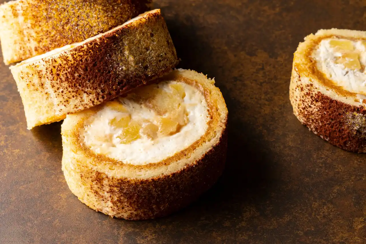 ふわふわのふんわり軽やかなシフォン生地で、りんごのコンポートと2種のクリームを包み込んだロールケーキ。カラメルのほろ苦さが、クリームチーズ入りの生クリームとりんごの自然な甘味を引き立てます。 |