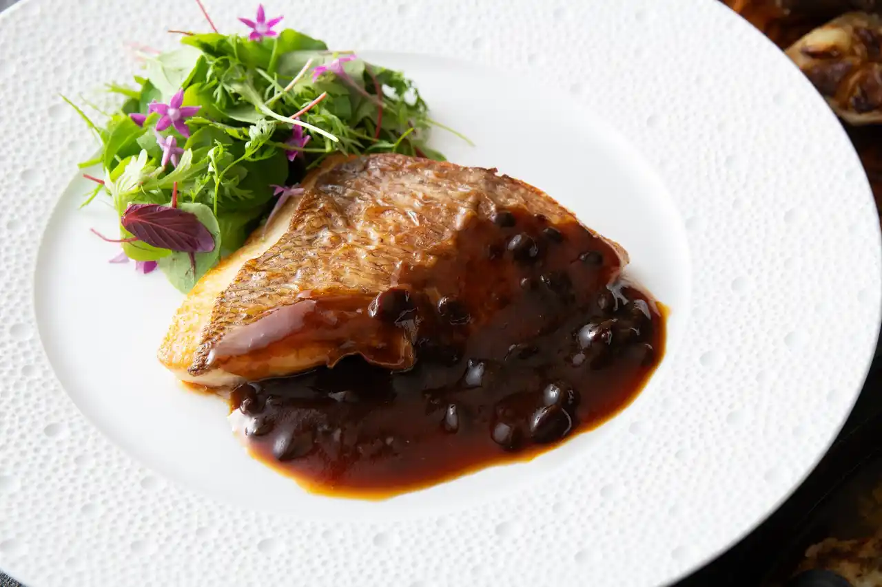 富士サーモンの昆布〆/鮑の鉄板焼 和風ソース または 平目と帆立貝のソテ 塩麹と醤油のバターソース/焼野菜/常陸牛サーロイン120g/ |