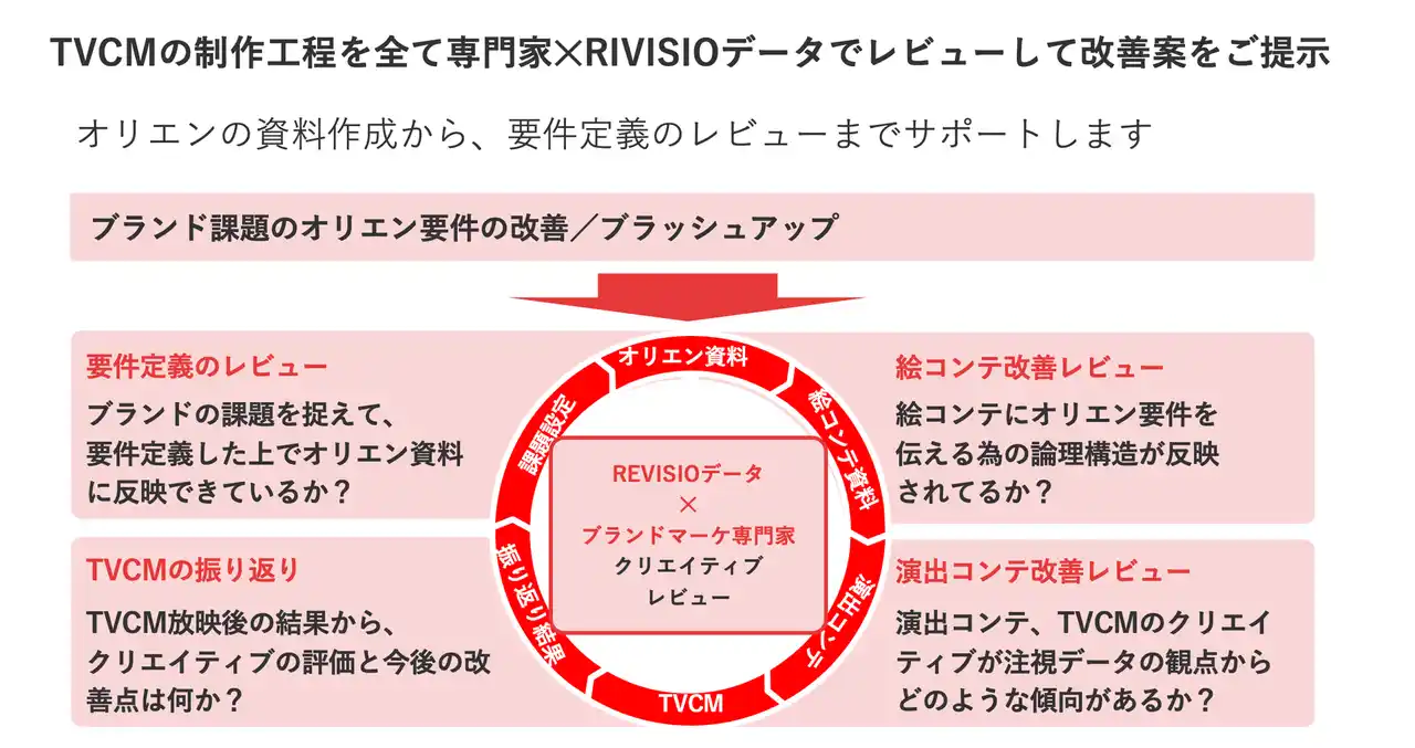 TVCM制作の根幹となる「オリエンテーション資料」の策定から、実際の「絵コンテ」「演出コンテ」、そしてTVCM放映後の効果検証まで、エキスパートによるレビューを実施します。このレビューにREVISIOが持つ独自の「注視データ」を掛け合わせることで、データに基づいた論理的な改善サイクルを構築します。これにより、以下のような成果を実現します。 |