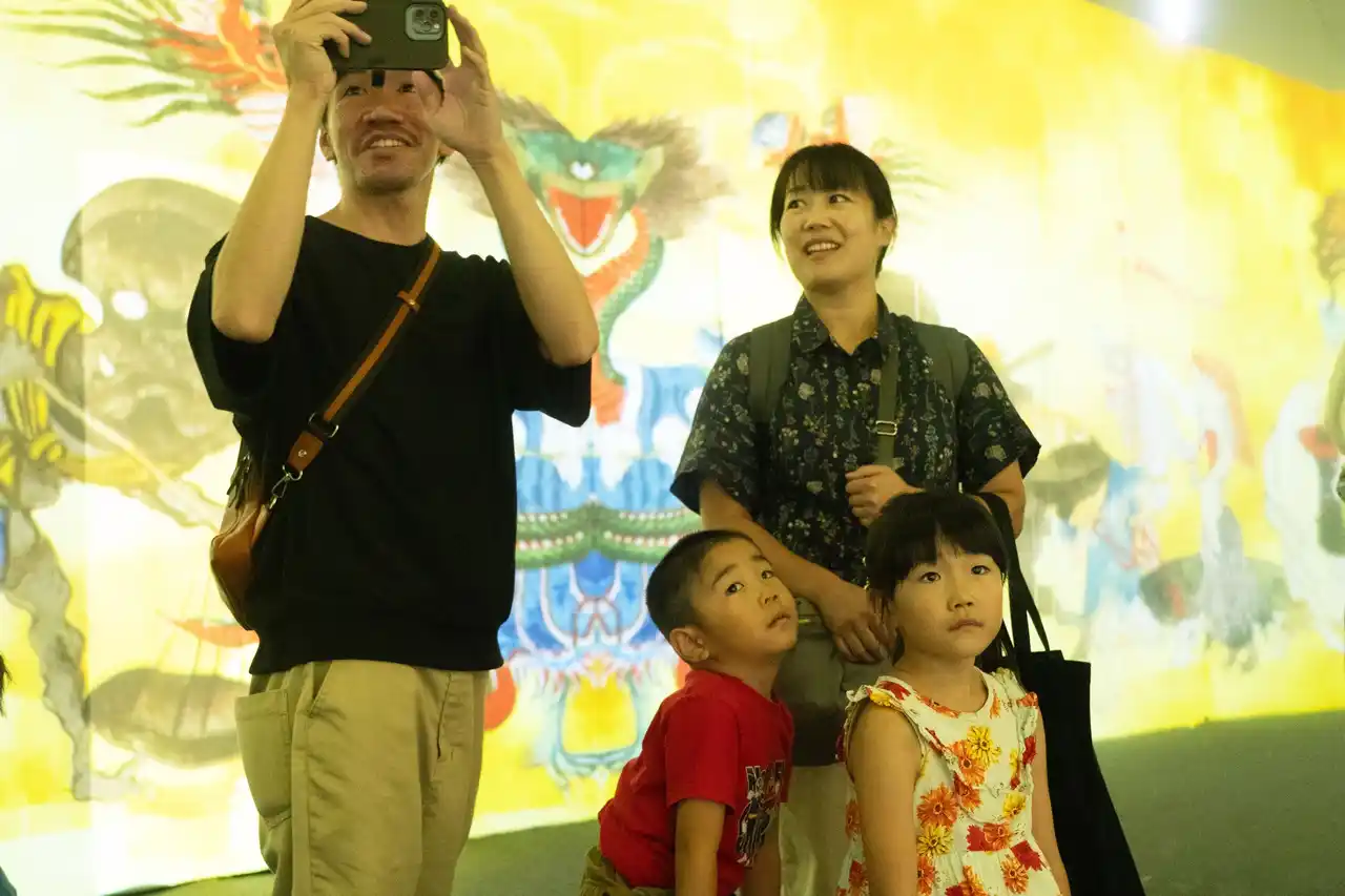 この度「動き出す妖怪展 NAGOYA」の来場者数が5万人を突破し、記念セレモニーを実施しました。5万人目の来場者は愛知県豊橋市からお越しのご家族で、記念品として「動き出す妖怪展」オフィシャルプログラム(公式図録)やオリジナルマフラータオル、トートバッグなどのグッズが、妖怪グリーティングに登場する「大天狗」から贈呈されました。ご家族からは「止まっている絵ではなく映像で妖怪が動くことで楽しめた」「子どもたちが遊べる工夫があって良かった」などの感想をいただきました。お子さまから大人の方までお楽しみいただける「動き出す妖怪展 NAGOYA」はお盆期間も休館日なしで開催中です。この機会に是非ご来館ください。 |