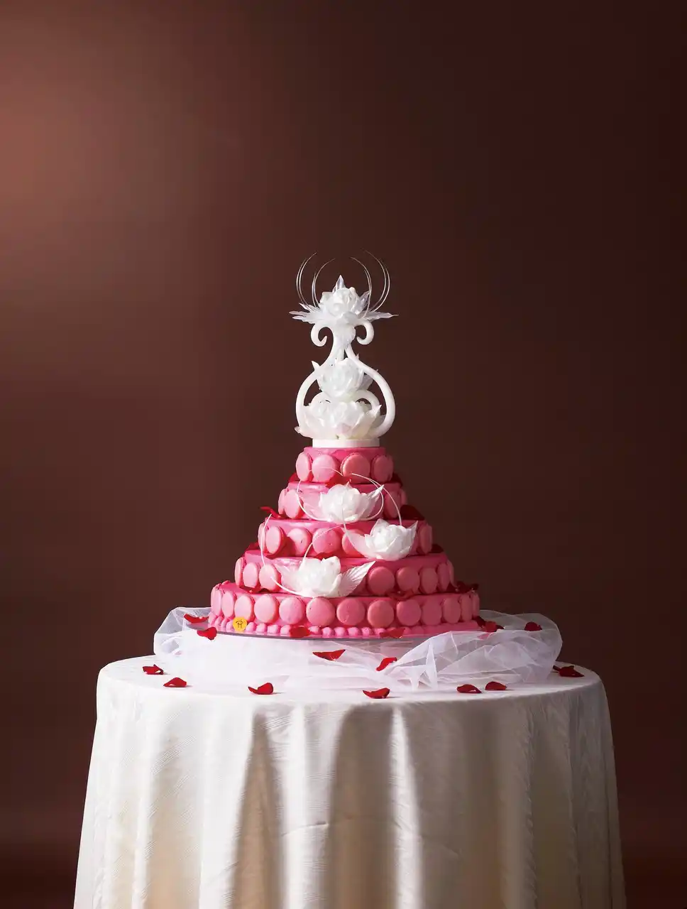 「ピエール・エルメ・パリ」の代表スイーツである『イスパハン』をアレンジしたウエディングケーキをはじめ、ホテルニューオータニ大阪のシェフパティシエが真心こめて作り上げたケーキの数々を約10種展示します。 |