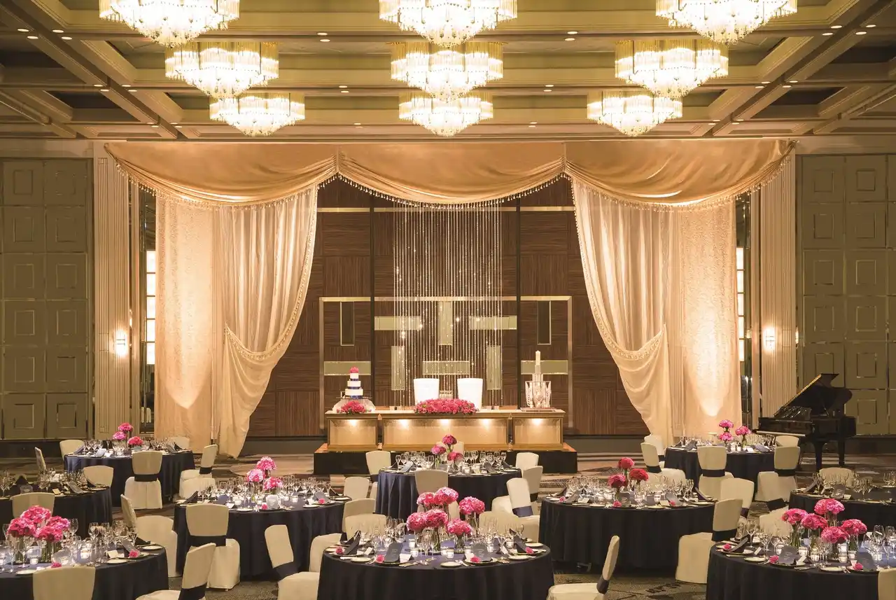 広々とした空間で天井には煌びやかなシャンデリアが光る豪華な宴会場 |