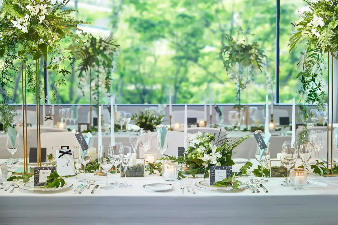窓の外には豊かな緑が映え、華やかな空間を演出できる披露宴会場 |