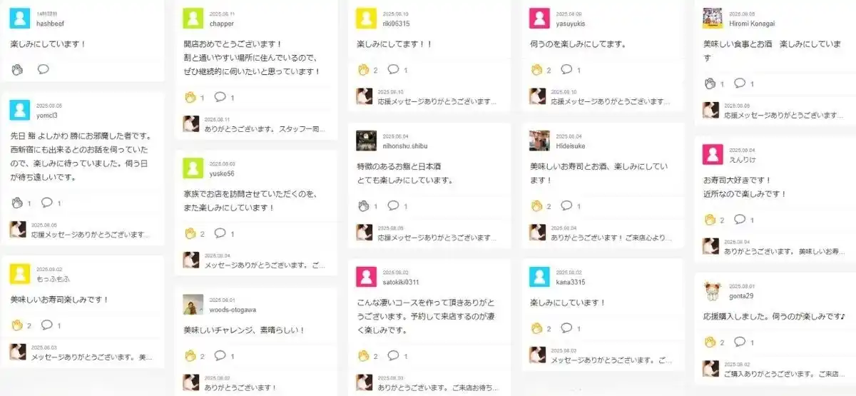 鮨よしかわファンの方や、近隣のお客様から温かい応援コメントが寄せられています。 |