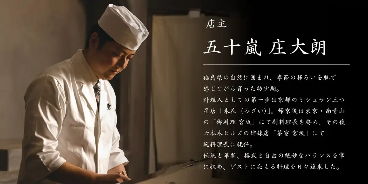 ミシュラン三つ星「未在」で鍛え、二つ星「御料理 宮坂」で腕を磨いた五十嵐庄大朗が、自身の名を冠した新たな懐石の舞台「御料理 無窮」を2025年9月4日、六本木ヒルズに開業します。 |