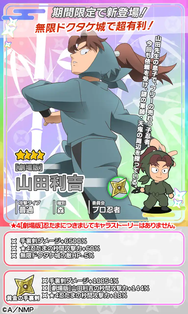 交換所に[劇場版]土井半助が再登場!虹の札を使用することで、限界突破用の[劇場版]土井半助と交換できます。課題をプレイして虹の札をたくさん集め、キャラクターを強化しましょう! |