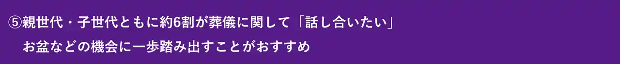 しかし、前述の通り、実際に「話したことがない」と答えた子世代は62.4%に上ります。この結果は、親子ともに会話の意思はあるものの、なかなかその一歩を踏み出せないという、共通の課題を浮き彫りにしています。お盆は故人様やご先祖様の冥福を祈りながら供養し、家族のつながりを再認識する大切な機会です。普段はなかなか口にできない終活の話題も、お盆の穏やかな雰囲気の中であれば、一歩踏み出して話せるかもしれません。遺影に使ってほしい一枚の写真や、思い出の曲など、まずは「ささやかなこと」から、親子で対話を始めることが、後悔のない見送りに繋がる第一歩となるでしょう。 |