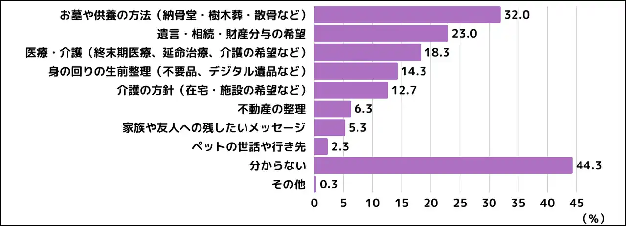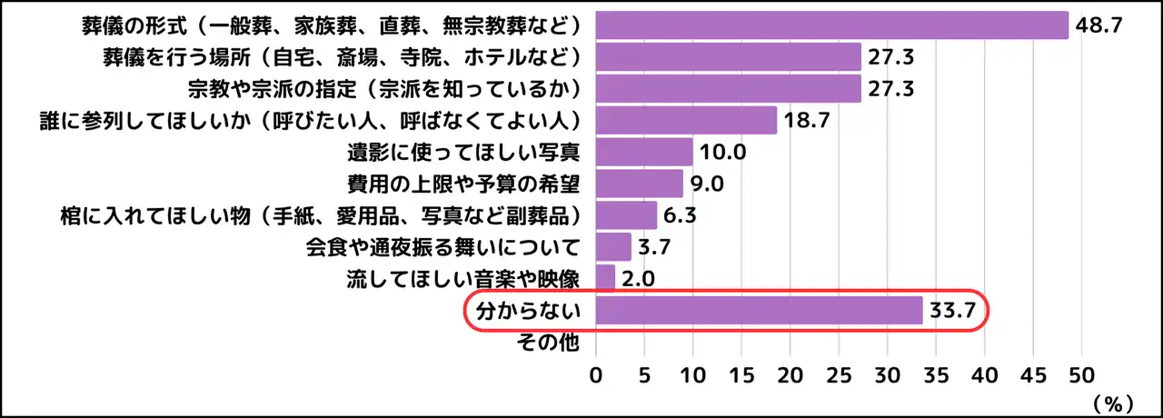 加えて、「誰に参列してほしいか(18.7%)」や「宗教や宗派の指定(19.7%)」といった、葬儀の形式や規模を左右する重要な要素についても、具体的な希望を持つ人は少ない現状です。 |