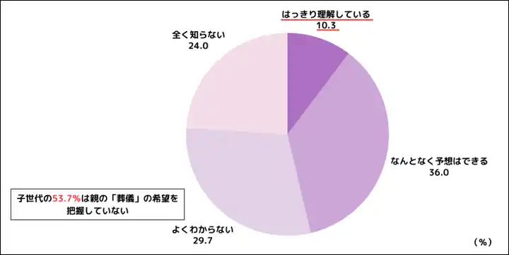 「親の希望に沿った葬儀をしたい」と考える子世代は57.7%に達しており、親の意向を尊重する強い姿勢が見られます。しかし、実際に親の意向を「はっきり理解している」人はわずか10.3%に過ぎず、「全く知らない」と回答した人は24.0%に上りました。これより、親の葬儀に対する強い思いがあるにもかかわらず、そのためのコミュニケーションが不足しているという、「想いはあるけど、親が求めているものが分からない」というギャップが浮き彫りになりました。 |