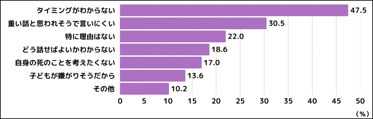 親世代では、45.0%が自身の葬儀について何らかの希望を持っていることが明らかになりました。しかし、そのうち実際に子どもに伝えている人はわずか17.8%に留まっています。親が話をためらう理由としては、「タイミングがわからない」(47.5%)や「重い話と思われそうで言いにくい」(30.5%)が上位に挙がり、対話への心理的な障壁が存在していることが浮き彫りになりました。 |
