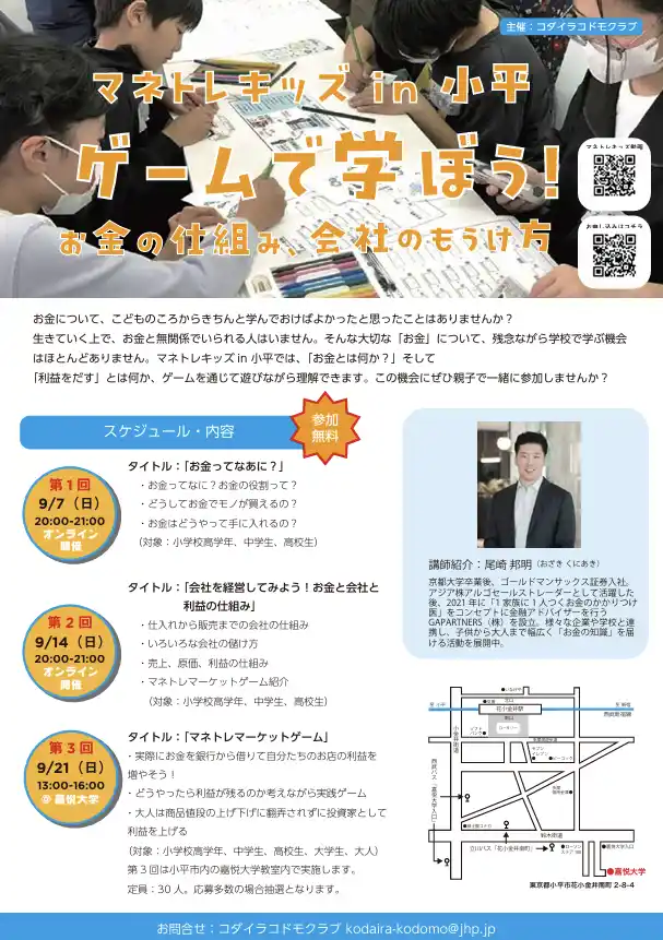 こどもから大人まで横断的な金融知識が身につくマネトレ大学を運営するGA Partners株式会社(本社:東京都港区 代表取締役社長:尾崎邦明)は、子ども向け金融教育プログラム「マネトレキッズ」を小平市コダイラコドモクラブとコラボし開講いたします。