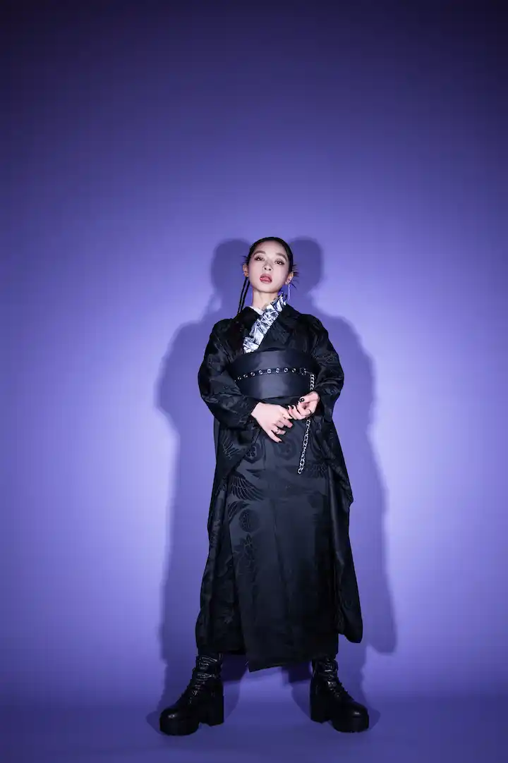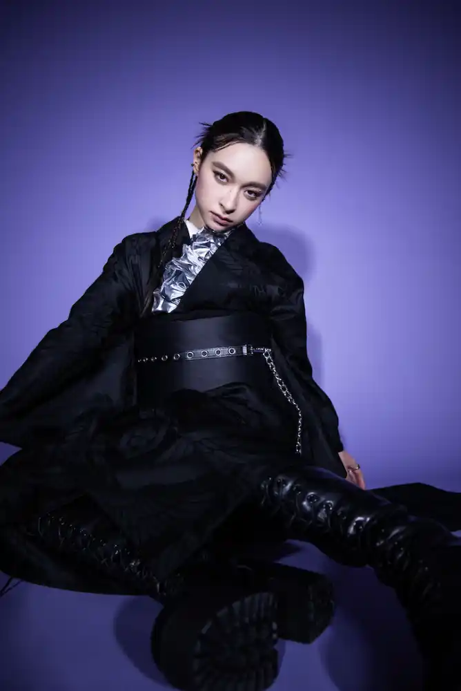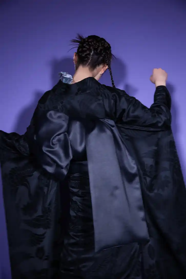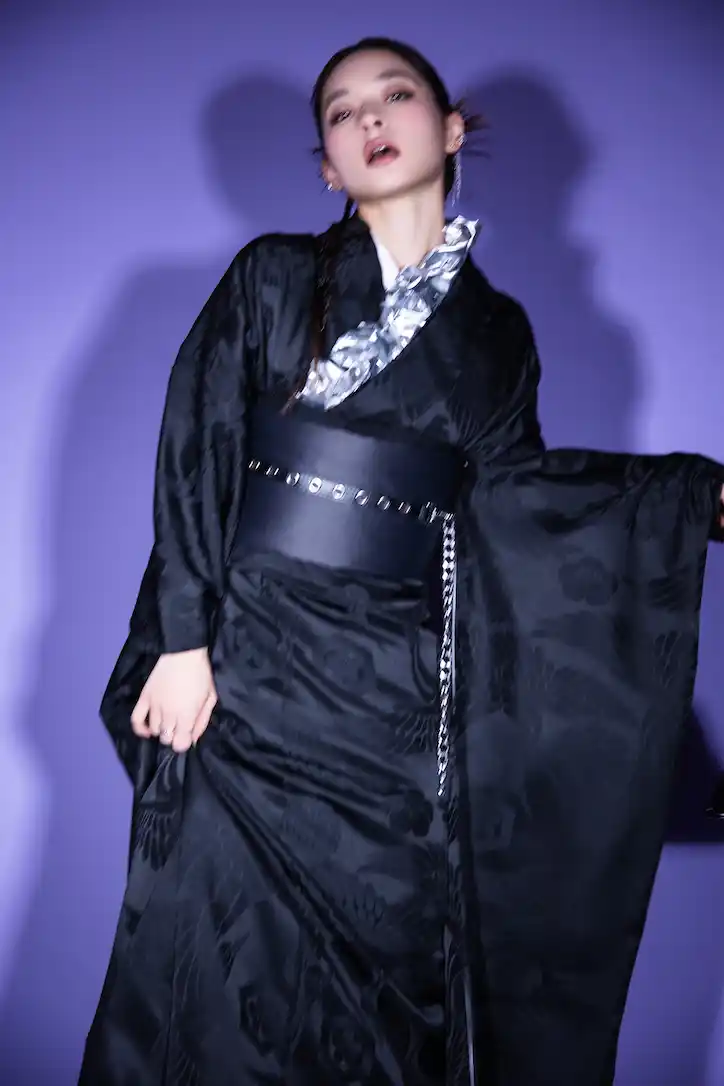 全体に字模様が入った光沢感のあるブラックの振袖に、スタッズやメタリック系の少しロックな雰囲気の小物を合わせ、ハードなディティールでエッジの効かせた新スタイリング。 |