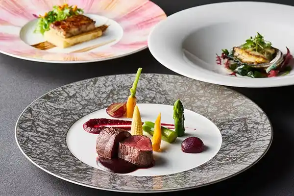 フォアグラ、ポルチーニ茸、鮑、蝦夷鹿などの高級食材と旬の素材を用い、リニューアルオープンににふさわしい贅沢な内容に仕上げたコース料理です。爽やかな果実味と繊細な泡立ちが特徴の「ポメリー ブリュットロワイヤル」はフリーフローで心ゆくまで味わうことができ、食欲をそそる赤い果実の香りに全体的なフレッシュ感がある「ポメリー ブリュット ロゼ」と、複雑な香りと長い余韻が特徴の「ポメリーアパナージュ ブリュット1874」は、お一人様1杯ずつ料理に合わせてご提供いたます。美食と美酒に酔いしれる特別プランです。 |