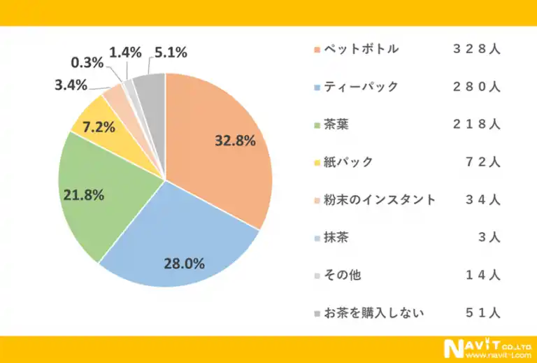 「どんなタイプのお茶を最も購入しますか?」という質問については、 「ペットボトル」が32.8%、「ティーパック」が28.0%、「茶葉」が21.8%と続きました。 |
