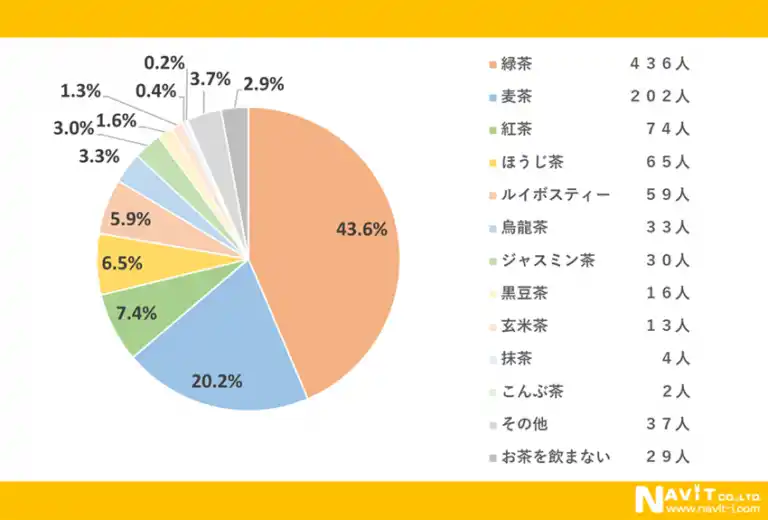 「どの種類のお茶を最も飲みますか?」という質問については、 「緑茶」が43.6%、「麦茶」が20.2%、「紅茶」が7.4%という順になりました。緑茶が人気のようです。 |