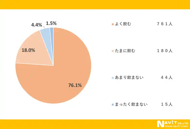 | 「あなたはお茶を飲みますか?」という質問については、「良く飲む」が76.1%、「たまに飲む」が18.0%と合わせると94.1%の人がお茶を飲んでいることが分かりました。 | |||