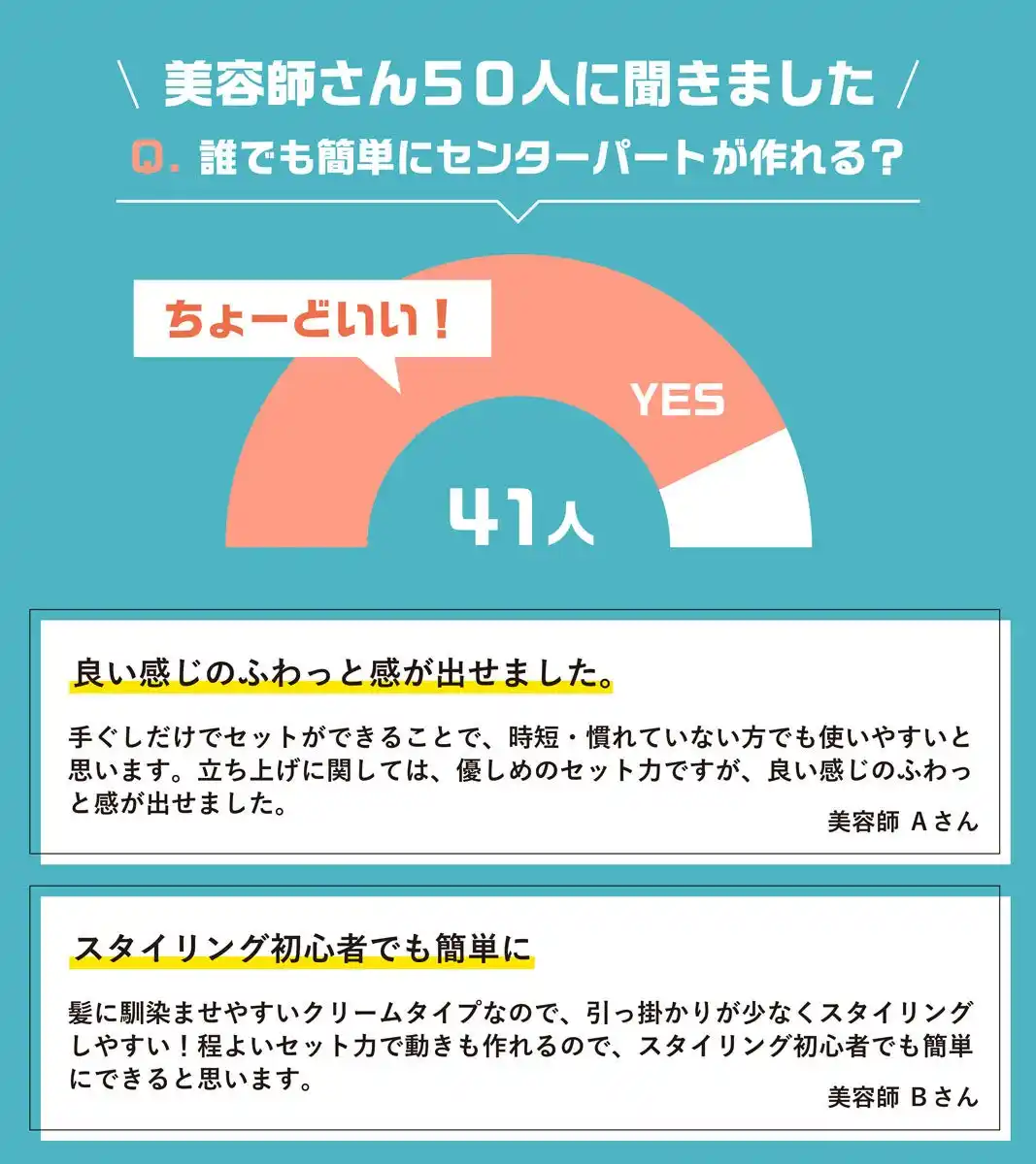 「クリームワックス 3.5」を50人の美容師さまに実際に使用いただきアンケートを実施しました。そのうち41人が「誰でも簡単にセンターパートが作れる」と回答し、美容のプロフェッショナルの視点でも、センターパートに最適なアイテムとして評価いただいています。 |