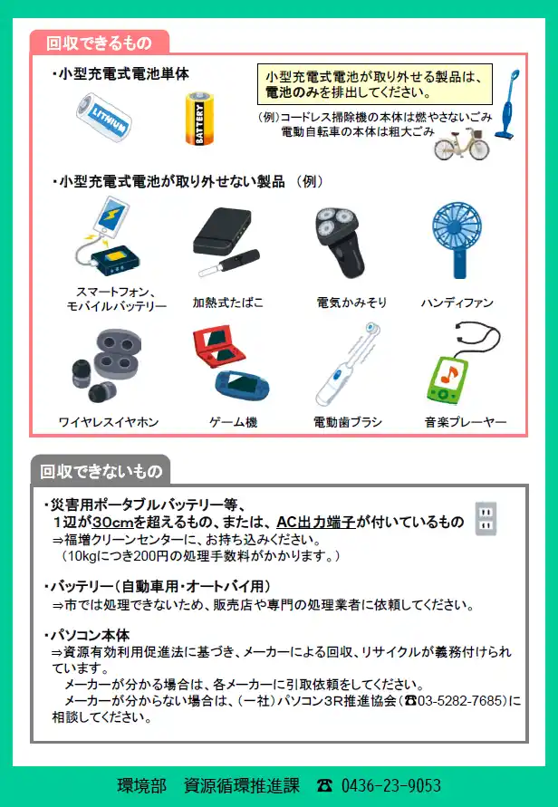 | 千葉県市原市では、市民の利便性向上や火災事故等の予防を目的として、10月よりリチウム蓄電池等の小型充電式電池を使用した製品をごみステーションで回収します。 | |||||||||