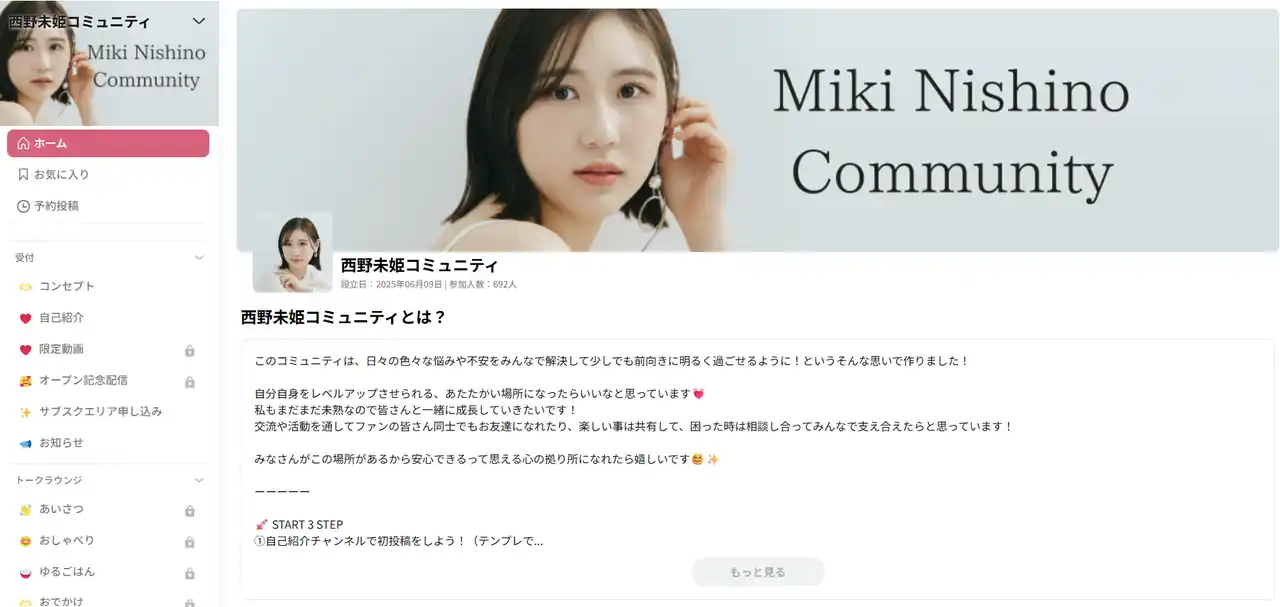 株式会社SHINSEKAI Technologies(本社:東京都渋谷区、代表取締役:大社 武、以下:当社)は、趣味でつながるコミュニティサービス「MURAコミュニティ」にて、タレント「西野未姫」公式ファンコミュニティ「西野未姫community」を2025年8月6日に開始しました。 |