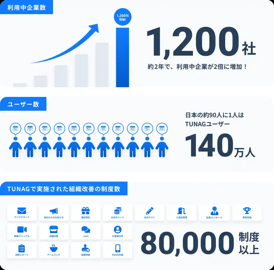 2016年のサービス開始以来、物流・製造・小売・医療業界などを中心に導入が進み、2025年8月時点で利用中企業数は1,200社、TUNAG上で実施された制度・施策の累計は8万件を超えました。 |