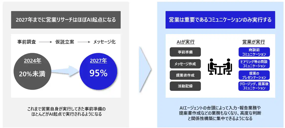 本提携では、AI時代における営業の役割を「顧客コミュニケーションに集中することによる成果の最大化」と定義し、「AIを使いこなす」のではなく「営業に当たり前にAIを装着する」ことで、業務生産性を高めることを目指します。 |