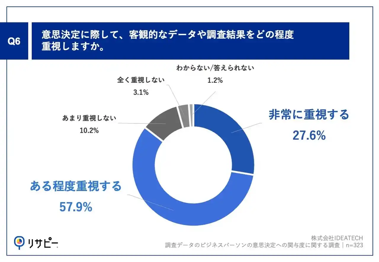 「Q6.意思決定に際して、客観的なデータや調査結果をどの程度重視しますか。」(n=323)と質問したところ、「非常に重視する」が27.6%、「ある程度重視する」が57.9%という回答となりました。