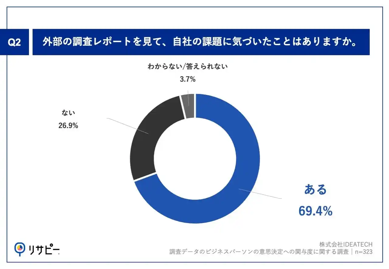 「Q2.外部の調査レポートを見て、自社の課題に気づいたことはありますか。」(n=323)と質問したところ、「ある」が69.4%、「ない」が26.9%という回答となりました。 |
